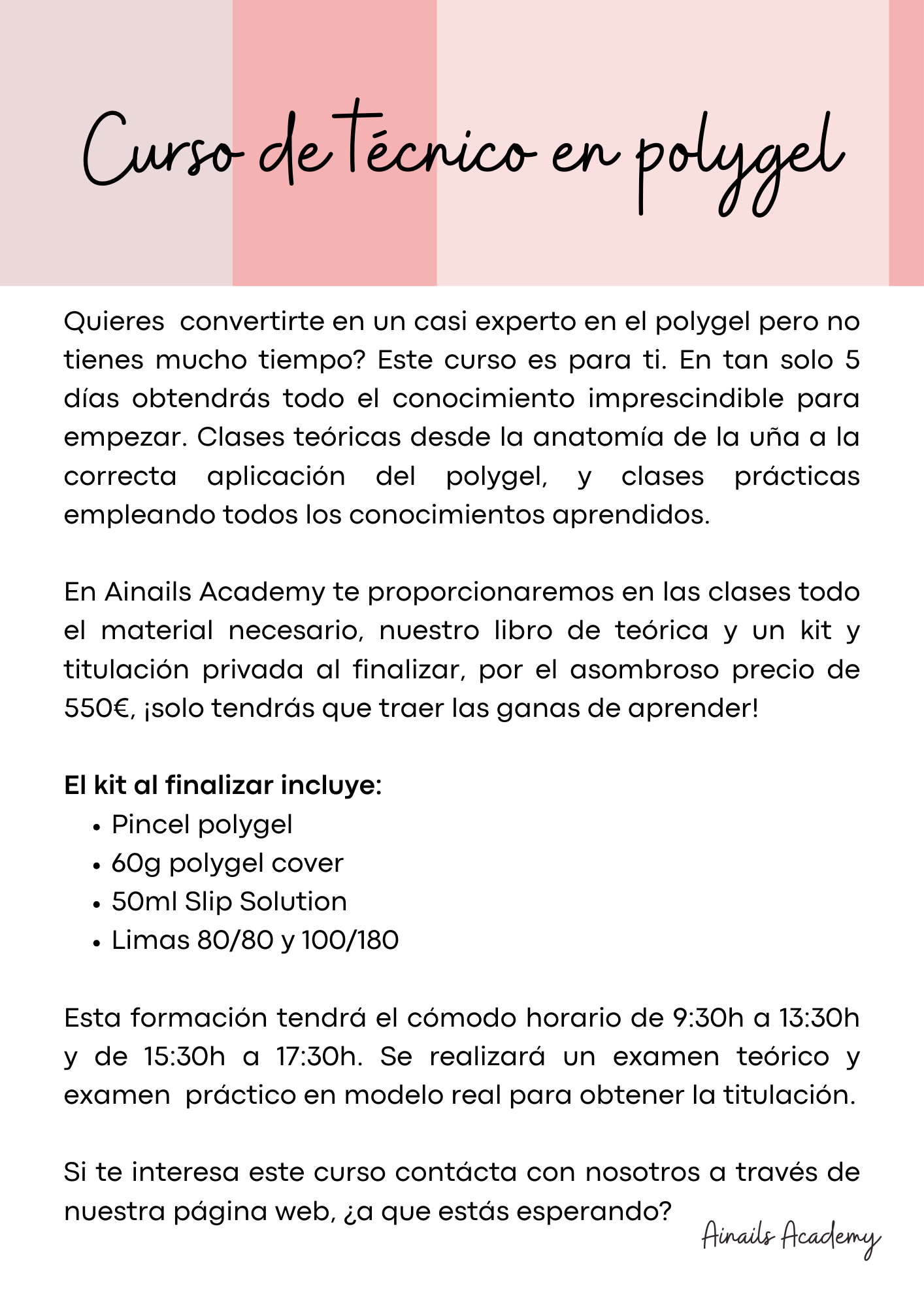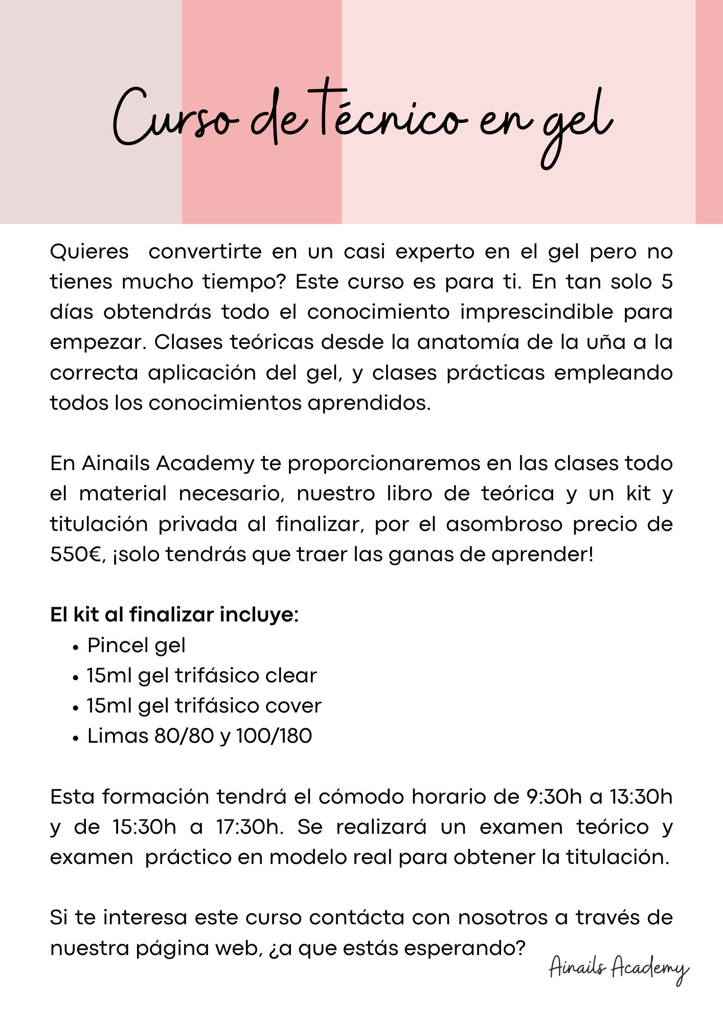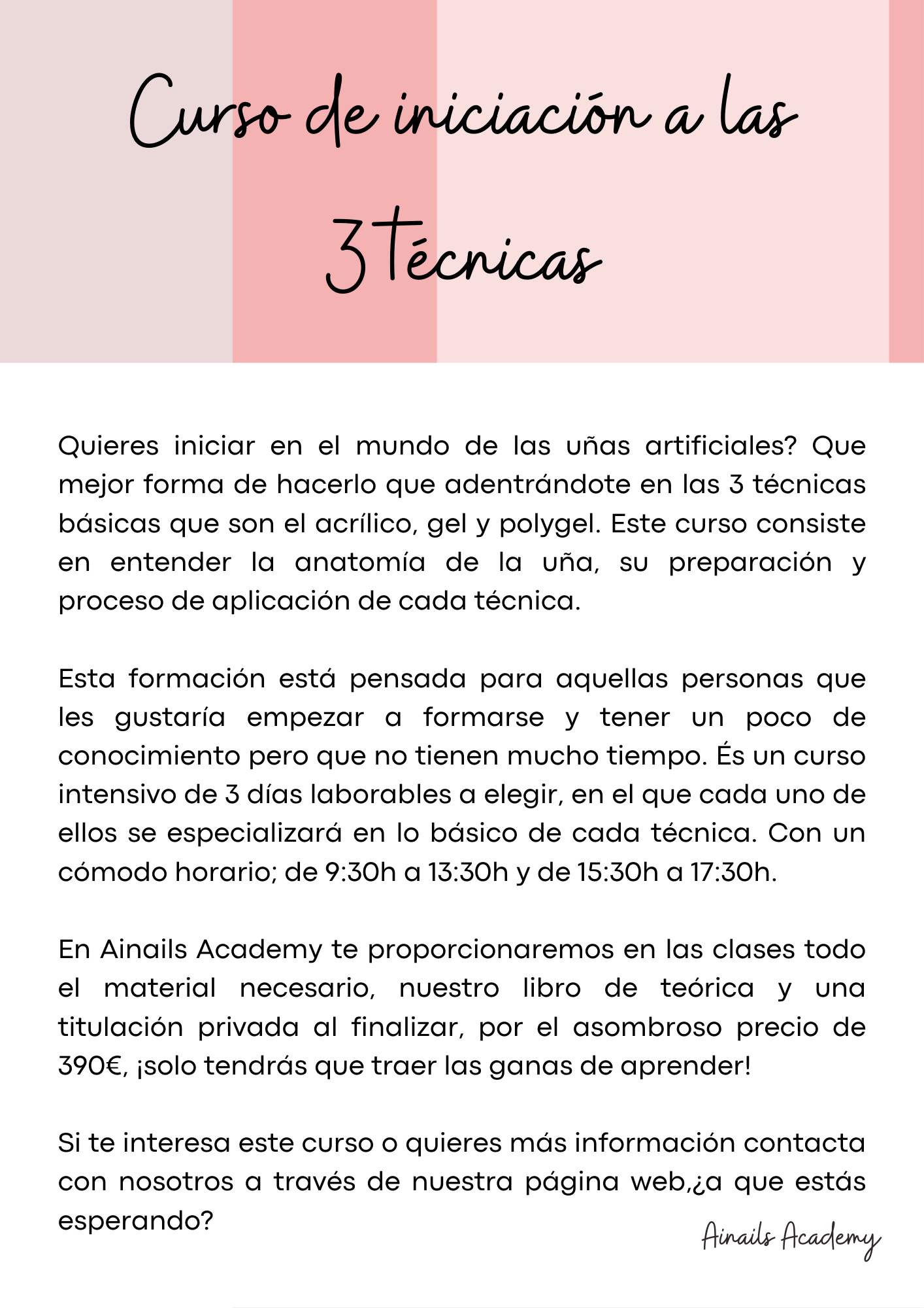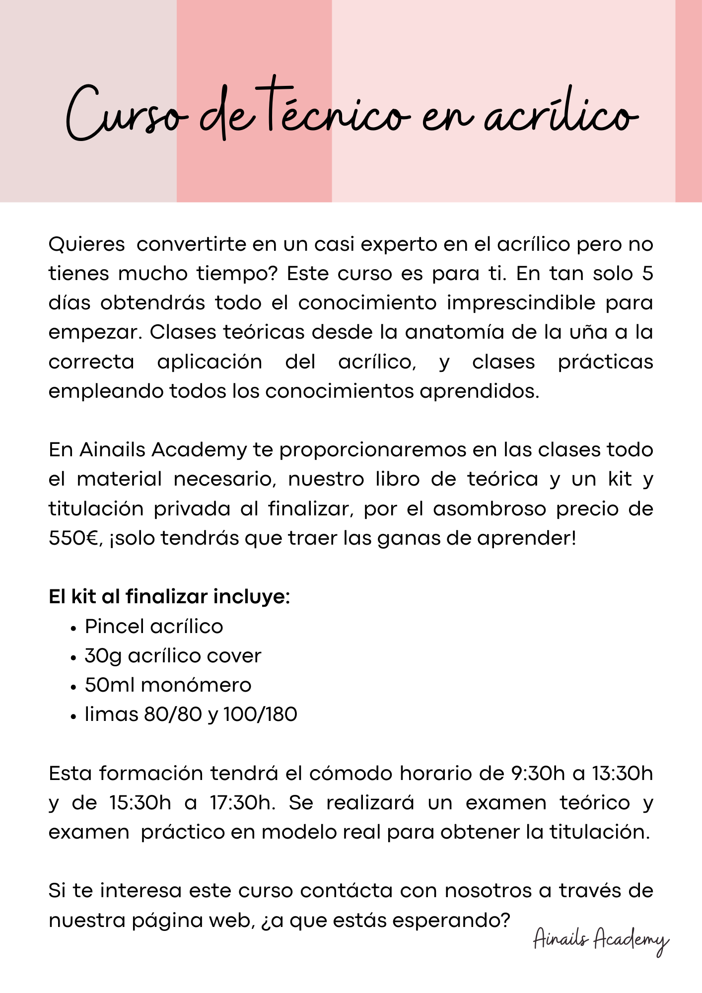 Nuestros cursos intensivos te preparan para el mundo real de las uñas acrílicas, manicura y pedicura, a precios increíbles. Obtendrás un certificado profesional que te permitirá montar tu propio negocio. ¡Invierte en tu futuro con Ainails Academy!